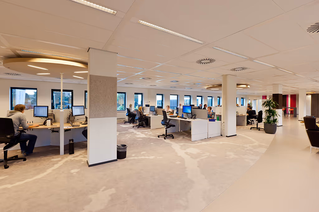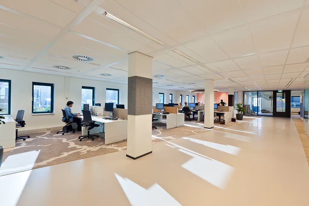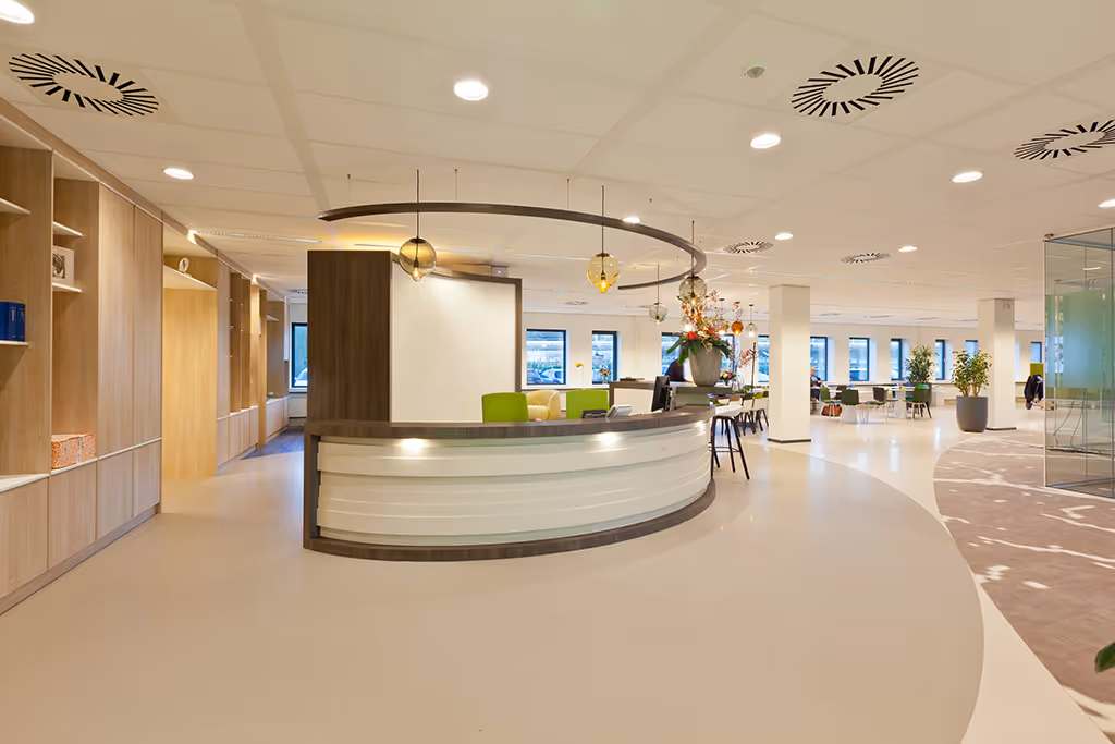 For Pensioenfonds Horeca & Catering we have designed a beautiful custom made carpet with a large grain pattern and gradient that continues in different rooms. The carpet is cut round in a number of places and fits nicely with the cast floor.