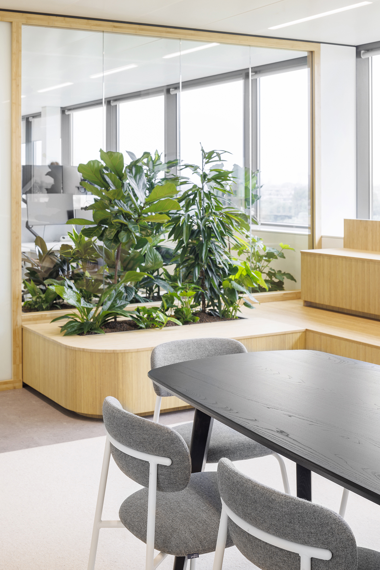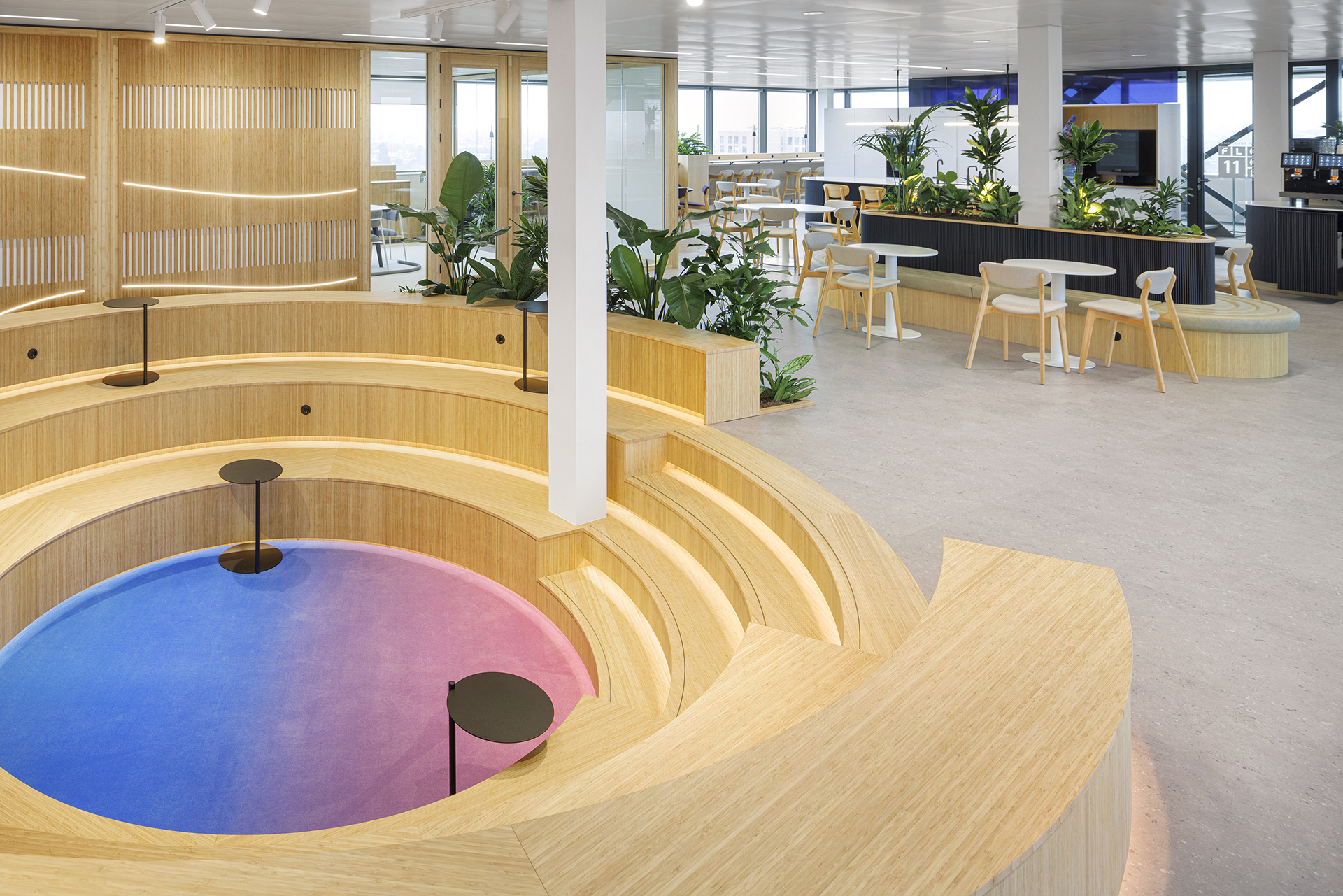 On the 11th floor of the renovated 1960s building, Maaike Veenstra Interior Design and styling Studio Anne Witten have created a breathtaking interior. They have translated the company's brand identity into the design in a unique way. For example, our SKY - Summer was specially adapted for the sunken seating area, making it a perfect match with the company's brand colours. The combination of neutral bamboo and the striking carpet makes the seating area a true eye-catcher.