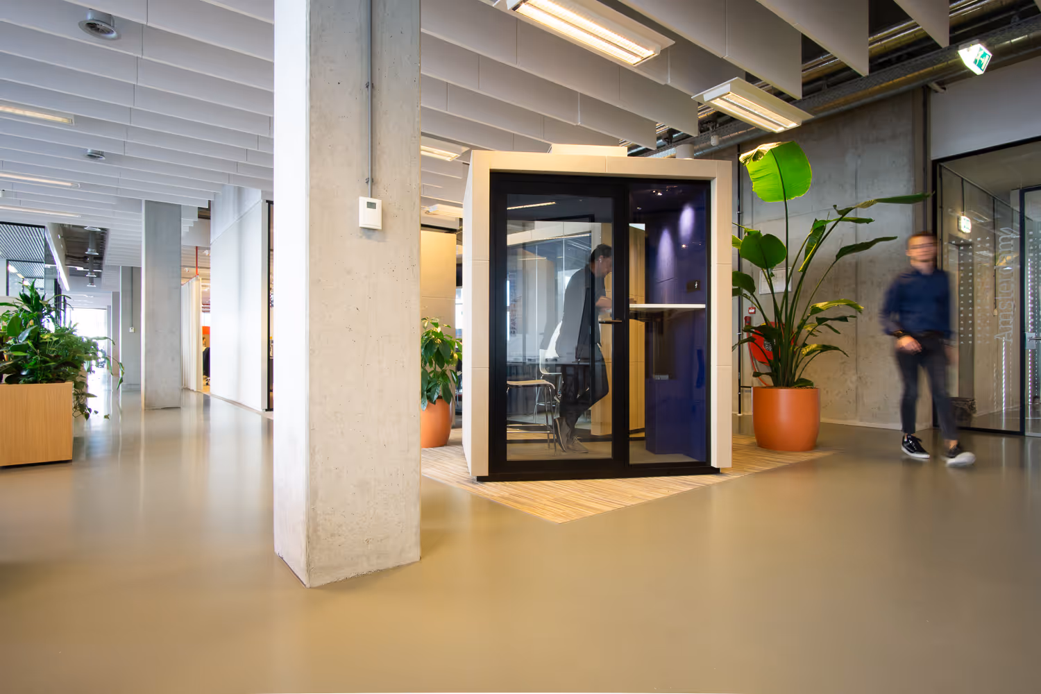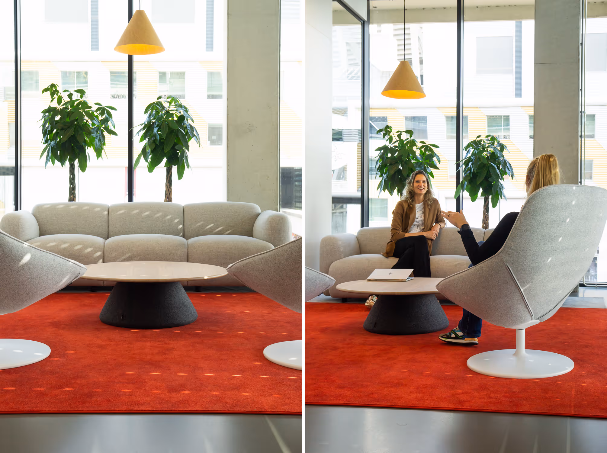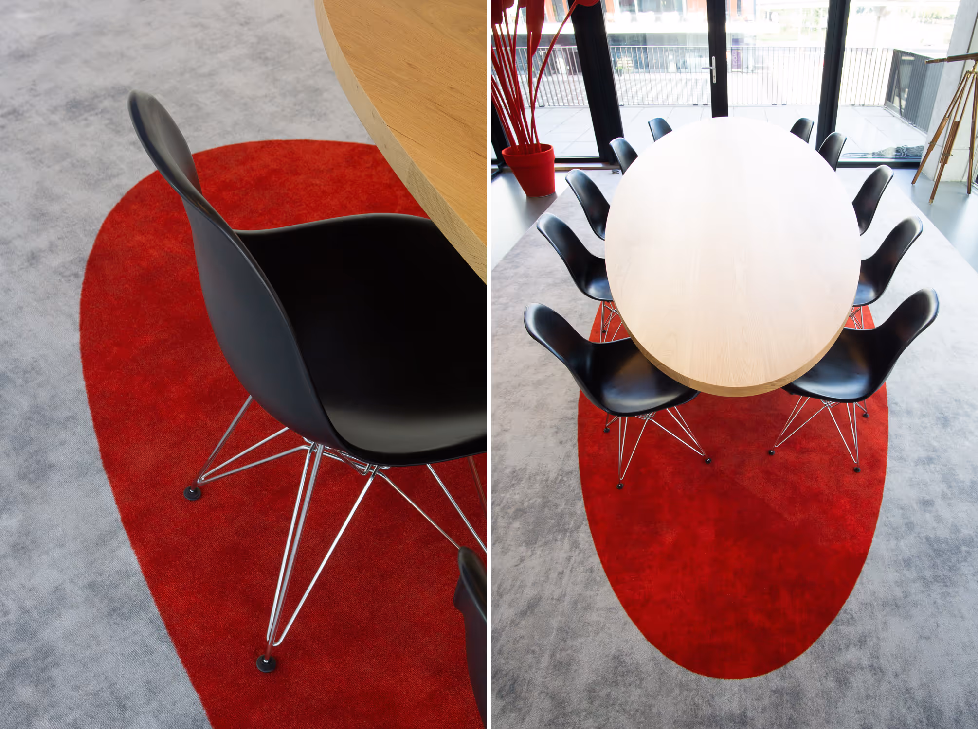 For TriFinance's new workplace, Ideal Projects has achieved a rigorous transformation in the functionalities and identity of the office with minimal adjustments. TriFinance's bright red corporate identity color plays an important role in the coherence of the new interior. Our BT43 carpet is used here in red and grey in a playful way, both on the floor and on the wall.