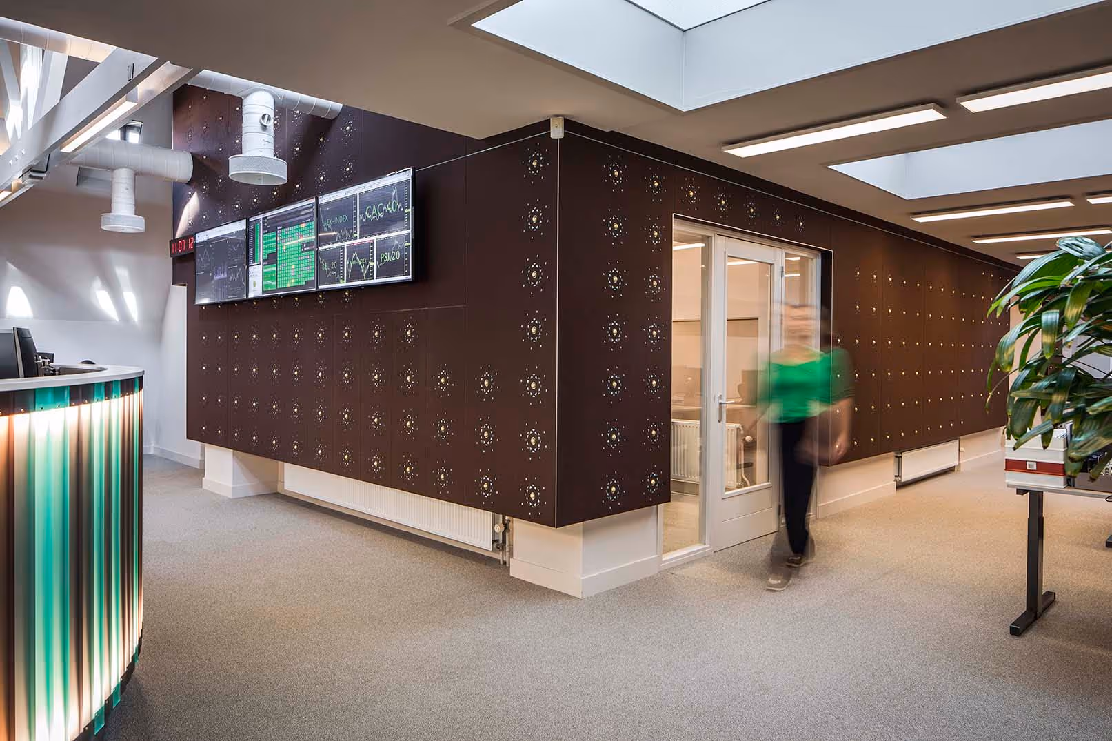 Euronext Market Services is gevestigd in het monumentale pand aan het Beursplein in Amsterdam. Op de zolder van het gebouw heeft de architect een fijne werkplek weten te creëren die in het oog springt. Hierbij zijn de kleuren en patronen afgeleid van de originele bouwstijl. De rechthoekige kern is bekleed met ons vilt waar we kristalmotieven uit hebben gesneden, verwijzend naar de koepeldecoraties in de hal.