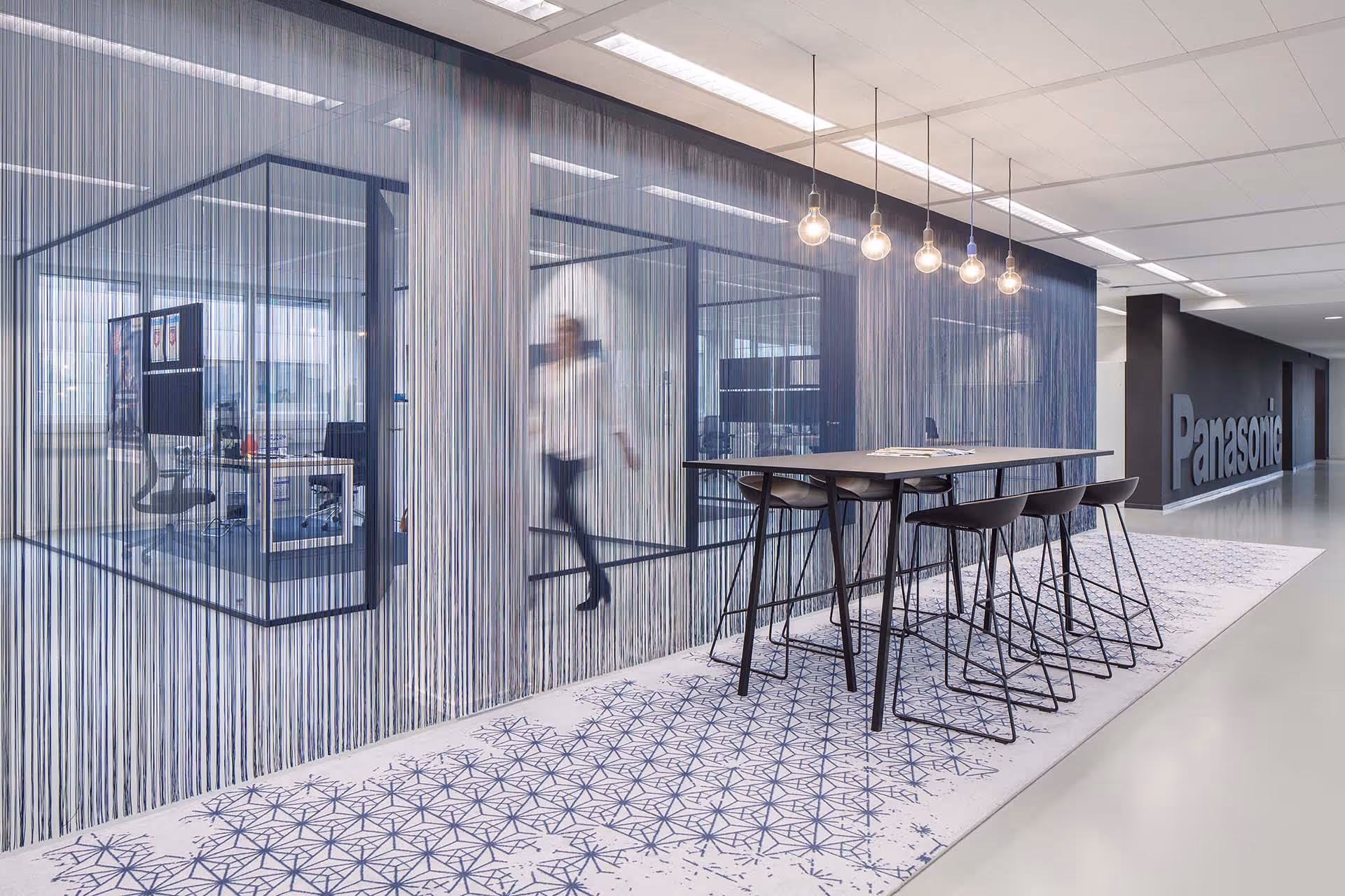Voor Panasonic maakte we het eye catching Caleido karpet in wit met blauw. Het past perfect bij de rest van het interieur. De meeting rooms zijn voorzien van onze Isares karpetten in de kleuren Rust, Deer en Dark Blue.