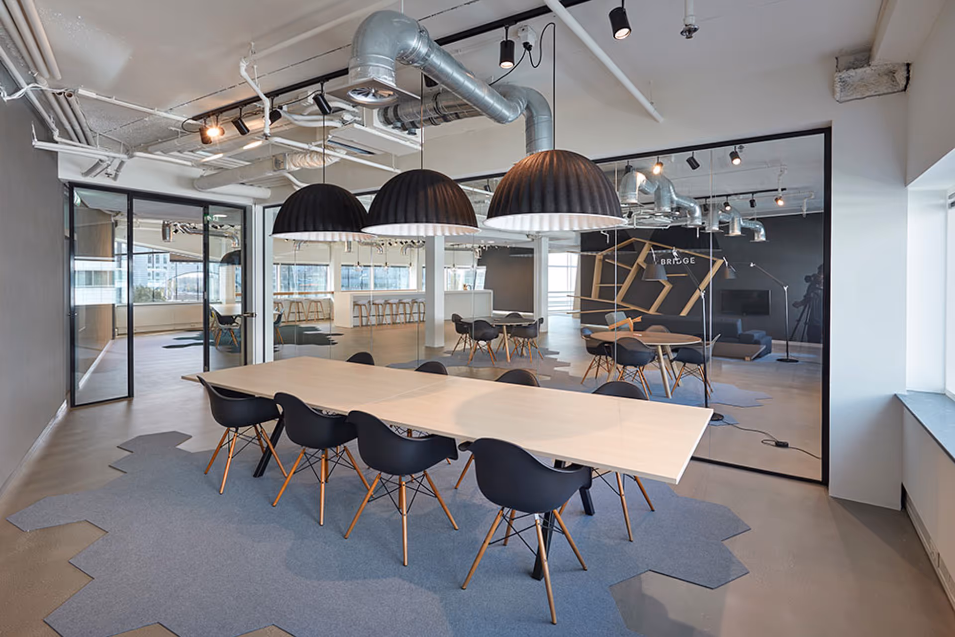 Het opvallende gebouw The Bridge in Den Haag heeft een nieuw interieur gekregen. Het kantorencomplex is geheel gerenoveerd waarbij het interieur een net zo opvallende look heeft gekregen als het exterieur. Het oog voor detail is merkbaar aan ieder aspect van The Bridge.
